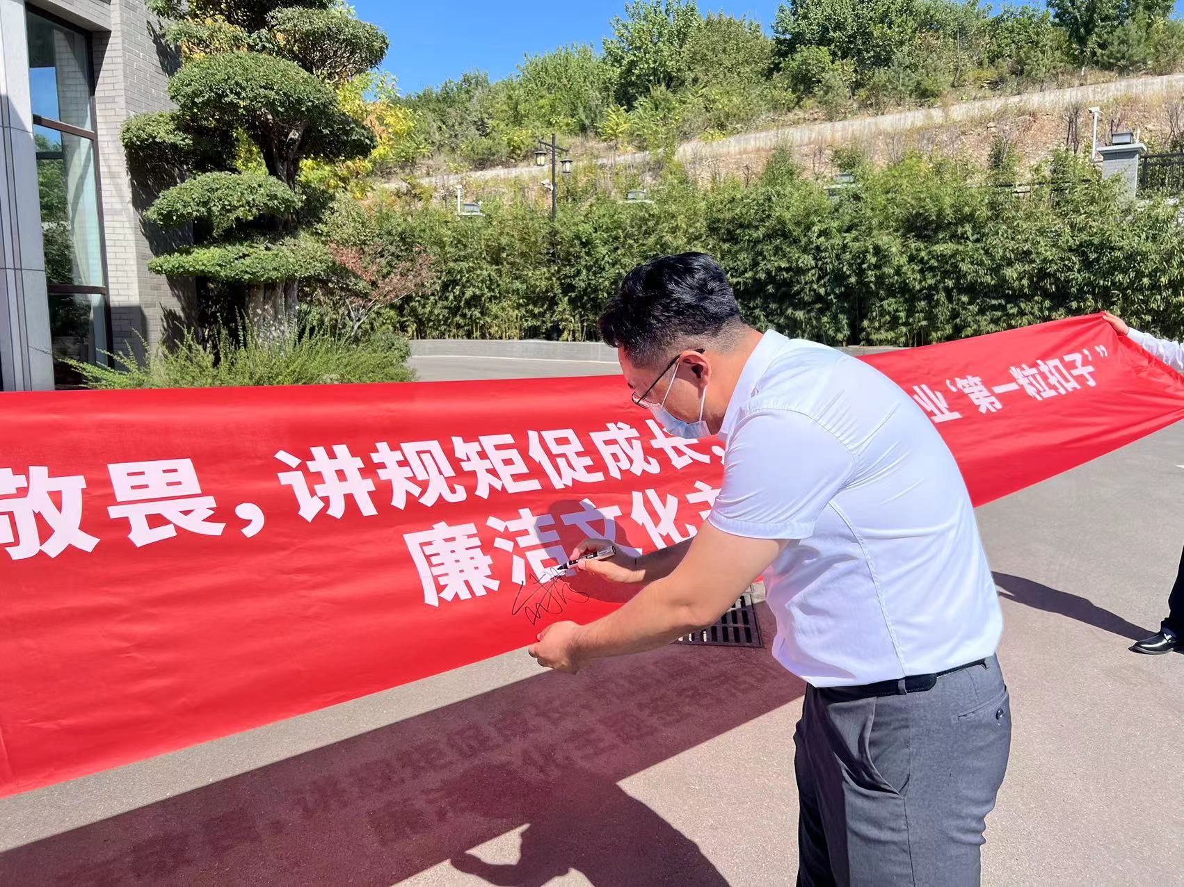 年輕干部在印有“守初心存敬畏,講規矩促成長,扣好廉潔從業‘第一粒扣子’”的廉潔文化宣傳教育月主題橫幅上鄭重簽下自己的名字,表達了筑牢思想道德防線、增強廉潔自律意識的堅定信念。