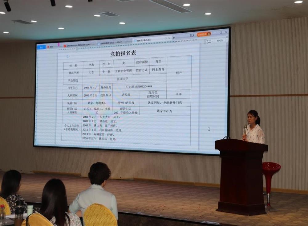 公司成立競拍領導小組,堅持“公開競拍、平等競爭、擇優錄取、注重實績”的原則,鼓勵員工毛遂自薦、積極報名。競拍店長依次上臺分別從管理門店2021年度經營收入目標、競拍上崗后的工作思路、設想及經營措施等方面進行演講。