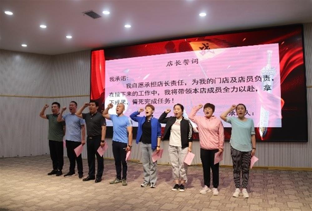 競拍店長舉起右手,莊嚴宣誓。我承諾:“我自愿承擔店長責任,為我的門店及店員負責,在接下來的工作中,我將帶領本店成員全力以赴,拿下成果,誓死拿下任務”!句句鏗鏘有力,字字擲地有聲,許下不辱使命的承諾,扛起不負眾望的擔當。