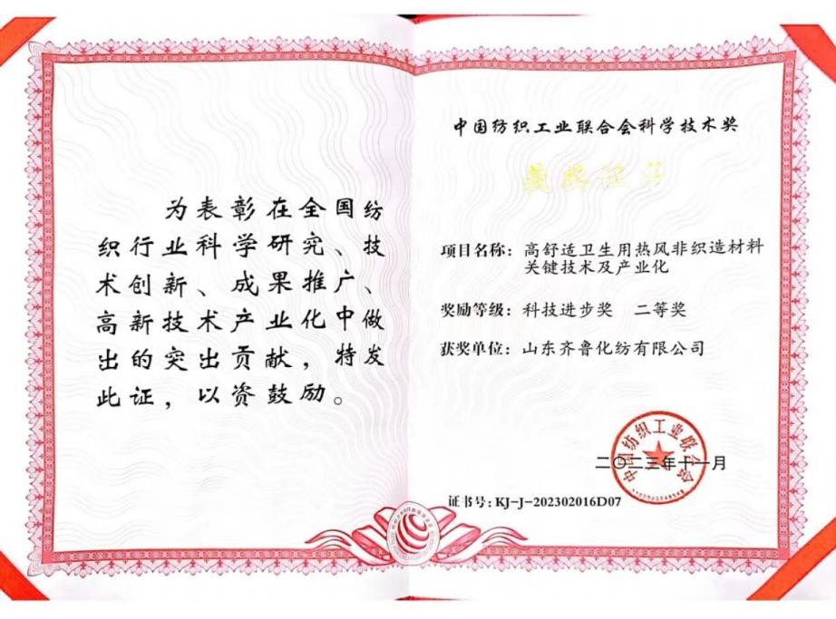12月6日上午,2023年度中國紡織工業聯合會科學技術獎勵大會在北京人民大會堂隆重召開。齊魯化纖集團山東齊魯化紡有限公司與天津工業大學產學研團隊共同開發的“高舒適衛生用熱風非織造材料關鍵技術及產業化”項目榮獲2023年度中國紡織工業聯合會科技進步獎二等獎,化紡公司副總經理唐元冰代表公司上臺接受表彰。